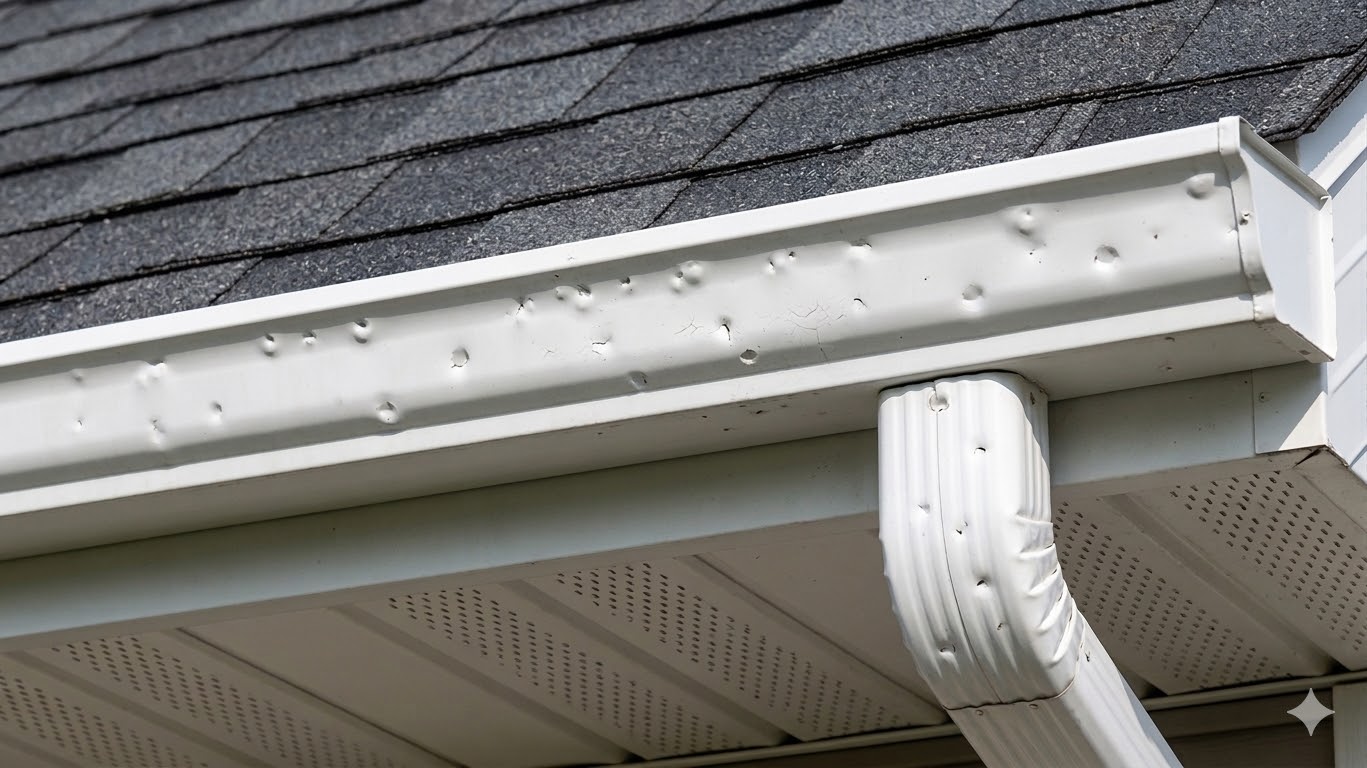 - Gutter and downspout dents (close-ups with scale reference)