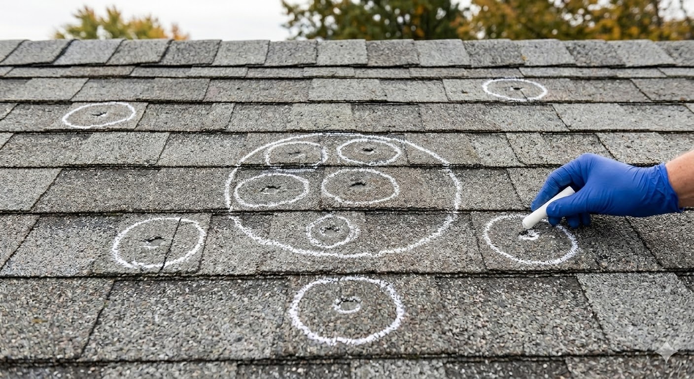 Collateral damage on soft metals and other surfaces corroborates your roof damage claim. If the gutters are dented, the AC unit is dinged, and the window screens are punctured, it's hard for the adjuster to argue the roof wasn't hit.